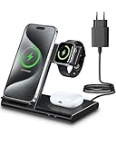 - 3 in 1 Kabelloses Laden für Apple Geräte: Laden Sie Ihr iPhone, iWatch und AirPods gleichzeitig mit dieser Ladestation für Apple Geräte. Kompatibel mit iPhone 16/15/14/13/12/11 (Pro/Max/Plus), iWatch Ultra/10/9/8/7/6/5/SE und AirPods Pro/4/3/2 (Hinweis: inkompatibel airpods 4 Keine Rauschunterdrückung Version) für eine effiziente und platzsparende Lösung