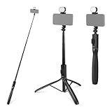 - 【Selfiestick Stativ mit Videolicht】 Der Handystativhalter für Handys lässt sich mit seiner Teleskopstange auf bis zu 170cm ausziehen, lässt sich jedoch für den Transport auf nur 33cm zusammenklappen. Er kann auch als Bodenständer für iPhones verwendet werden und verfügt über verstärkte Beine für Stabilität beim Fotografieren. Ein abnehmbares Fülllicht mit einstellbarer Farbtemperatur hilft bei der Ausleuchtung von Motiven bei schlechten Lichtverhältnissen