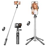 - 【Leicht und Tragbar】Das integrierte, tragbare Design kombiniert ein selfie stick und ein stativ in einem. Dieses phone stativ foto videokits lässt sich auf nur 13,58 '' zusammenklappen und wiegt nur 12oz. Das leichte und kompakte Design ermöglicht es, es problemlos in einen Rucksack oder eine Handtasche zu stecken. Ob beim Wandern, Bummeln in der Stadt oder auf alltäglichen Ausflügen dieses smartphone stativ ist jederzeit und überall der perfekte Begleiter, um Ihre Aufnahmen spontan und einfach zu machen.