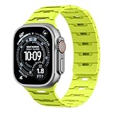 - 【Atmungsaktives Poröses Design】Das poröse Design macht dieses Magnet Silikon-Uhrenarmband leichter und atmungsaktiver. Die unterschiedlichen Farben auf Vorder- und Rückseite verstärkt die visuelle Wirkung des Armbands und macht es noch stilvoller und schöner. Dieses Silikonarmband lässt sich einfach anbringen und werkzeuglos wechseln. Es sorgt für ein frische und komfortabler Tragegefühl für Ihre iWatch Ultra, damit Sie Ihren aktiv und leidenschaftlich Lebensstil in vollen Zügen genießen können