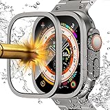 - [Militärqualität Vollständiger Schutz] Der Luft- und Raumfahrt-Titan-Stoßdämpfer deckt die obere Kante der Apple Watch Ultra vollständig ab und verfügt über gehärtetes Glas militärischer Härtegrad 9H, um Ihre Uhr vor Kratzern, Stößen und Stürzen zu schützen. Eine ausgezeichnete Abdichtung und eine perfekte Passform verhindern das Beschlagen des Bildschirms.