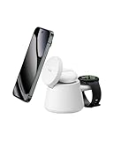 - BIS ZU DREI GERÄTE LADEN: Laden Sie Handy und Kopfhörer gleichzeitig auf kabellosen Pads. Ein integrierter Watch-Halter mit USB-C-Anschluss eignet sich für offizielle Smartwatch Ladegeräte (nicht enthalten) für Smartwatches von Samsung, Google und Apple.