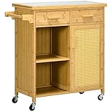 HOMCOM Küchenwagen mit Schublade, Schrank, offenem Ebenen, Servierwagen, Aufbewahrungswagen mit Handtuchhalter, Glastischplatte, Bambus, Natur, 84 x 36 x 85 cm