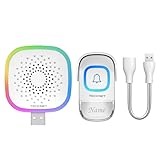 - Türklingel-Set mit RGB-Anzeige: Wird der Sender gedrückt und ein Signal empfangen, blinkt die RGB-Anzeige am batteriebetriebenen Empfänger. Die Reichweite beträgt 400 m im freien Gelände. Diese Wasserdicht Aussen Haustür Klingel für den Außenbereich verfügt über 60 wählbare Klingeltöne und 5 einstellbare Lautstärken (0 dB bis 100 dB).