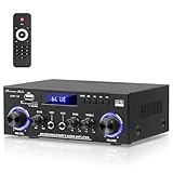 - 【AMP-10 Upgrade-Verstärker für Heim-Audio】 Dieser Bluetooth-Heim-Audioverstärker vereint mehrere Funktionen in einem Gerät. 2.0-Kanal, 50 W + 50 W Nennleistung, Spitzenausgangsleistung bis zu 600 W! Ermöglicht den Betrieb eines aktiven Subwoofers, mit Höhen- und Bassregelung, Bluetooth-, USB- und RCA-Eingängen, FM-Radio, 2 MIC-Buchsen, dem Mikrofoneingang mit Echokontrolle, mit dem Sie Ihre Stimme feinabstimmen können. Bluetooth-Empfängerverstärker, kompatibel mit Hochleistungslautsprechern, keine Verzögerung auch bei längerem Gebrauch, perfekt für Heim-Audiosysteme