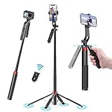 - 【All in 1 Selfie Stick Handy Stativ】Ein ausziehbares Stativ, das als Handy, Selfie Stick, Go Pro und Kamerastativ verwendet werden kann. Dieses Stativ für iPhone kann schnell zwischen Tischstativ und Selfie-Stick-Modus wechseln. Eingebaute faltbare lange Beine und rutschfeste Fußpolster machen die Basis größer und stabiler.