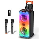 - MULTIFUNKTIONALE KARAOKE MASCHINE: Diese tragbare Karaoke Maschine ist mit 2 x 3-Zoll-Premium-Lautsprecher, Bluetooth 5.2 Konnektivität, 2 Anti-Interferenz drahtlose Mikrofone (benötigt 2 AA-Batterien), lebendige und dynamische farbige Lichter ausgestattet. Und es unterstützt den Anschluss an TV, Smartphone, ipad, kompatibel mit YouTube, TikTok und alle Streaming-Apps, und unterstützt auch micro TF-Karte, USB und AUX. Diese Karaokemaschine kombiniert Lautsprecher, Mikrofon, Radio, Mediaplayer und Gitarrenverstärker, was sie zum perfekten Begleiter macht, um Spaß zu haben.