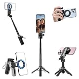 - [MagSafe & Universell ]: Kompatibel mit iPhone 12–16 MagSafe Modellen und Hüllen, lässt sich dieser Selfie Stick Stativ direkt ohne Metallplättchen befestigen. Für Android- oder nicht-MagSafe-Handys ist ein Metallring im Lieferumfang enthalten. Die um 360° drehbare Halterung mit 225° Neigung sorgt für den perfekten Winkel, während zwei Cold-Shoe-Anschlüsse Platz für Licht, Mikrofone oder weiteres Zubehör bieten.