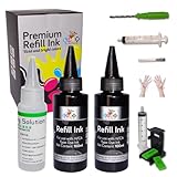- Das umfassendste Set auf dem Markt enthält: 2 Flasche schwarze Tinte 100 ml, 1 Flasche Cyan Tinte 100 ml, 1 Flasche Magenta-Tinte 100 ml, 1 Flasche gelbe Tinte 100 ml, 1 Flasche 50 ml Kopfreinigung, 5 Spritzen und 4 Nadeln, 1 Handheld, 1 1 Paar Einweghandschuhe, 1 Entlüftungsclip, schriftliches Handbuch für eine korrekte Befüllung.