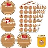 - ❤️ Handmade Aufkleber – Mit Liebe gemacht: 120 runde Kraftpapier-Sticker (Ø 4 cm) in 4 verschiedenen Designs. Perfekt zum Verschönern und Beschriften von selbstgemachten Marmeladen, Keksen, Kerzen oder Geschenken.