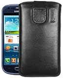 - Hülle Leder schwarz - ideales Smartphone Zubehör mit praktischem Klettverschluss zum sicheren Verschluss, verhindert das Herausfallen des Samsung Galaxy S3 mini aus der Ledertasche.