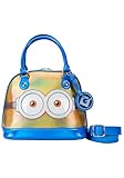 - Auf der Vorderseite erscheint ein Minion in glänzendem Gold und blau schillerndem Detail. Seine großen Augen sind umrahmt von einer silbernen Brille mit transparentem PVC-Material über der Vorderseite, um durchsichtige "Gläser" zu schaffen. Ein Anhänger aus Kunstleder in Blau zeigt ein gedrucktes Bild des "Gru's"-Symbols, und dieses Symbol bildet eine geprägte Zugabe auf der Rückseite der Tasche, die in den goldenen Hintergrund einfügt.