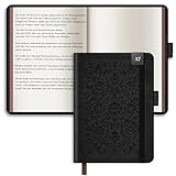 - Praktische Details: Das elastische Verschlussband hält alles mit einer einfachen Umdrehung zusammen, sorgt dafür, dass die Blätter in einer kleinen Tasche nicht auseinanderfallen, und kann außerdem zusätzlich einige lose Zettel oder Quittungen festhalten. Ein Leseband markiert die letzte Schreibstelle, beim Öffnen liegt direkt die nächste Seite bereit, kein Suchen nötig. Ein seitlicher Stifthalter aus elastischem Band sichert einen Stift, beim Aufschlagen ist sofort Schreibbereitschaft. Der feste Buchrücken ermöglicht 180° flaches Aufklappen, ohne mit der Hand nachdrücken zu müssen, Schreiben ist kraftlos.