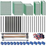 - Das Kit umfasst 21 doppelseitige Platinen in 5 verschiedenen Größen (1×9X7cm + 5×7X5cm + 5×6X4cm + 5×7X3cm + 5×8X2cm), die sich perfekt für Elektronik-Projekte unterschiedlicher Größe eignen. Ergänzt werden sie durch 22 standardisierte Stiftleisten (2.54mm) – darunter 12 gerade männliche, 2 gekröpfte männliche und 8 gerade weibliche Stiftleisten – sowie 13 Schraubklemmen (8×2-Pin + 5×3-Pin), 60 farbcodierte Jumper Caps (20 blau, 20 rot, 20 schwarz) und 35 Kabel Steckbrücken (15x M2F, 15x M2M, 5x F2F). Alle notwendigen Zubehörteile sind in einem Set enthalten, sodass du keine separaten Einkäufe tätigen musst.