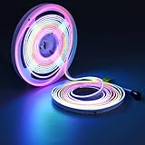 - Hochwertige Lampenperlen. Im Vergleich zu Streifen mit LED-Chips wie 5050SMD verwenden FCOB -Streifen FCOB-Perlen als Lichtquelle und sind mit Klebstoff beschichtet, um ein gleichmäßigeres und konsistenteres Licht zu erzeugen, während FCOB RGB WS2811 LED-Streifen keine dunklen Flecken aufweisen, was eine gleichmäßigere und hellere lineare Beleuchtung gewährleistet.(Spannungsabfälle usw. sollten bei der offiziellen Verwendung berücksichtigt werden)