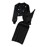 GORGLITTER Rippenstrick Kleid Mit Jacke Set Elegant Zweiteiler Cami Mit Schlitz 2 Teiler Schwarz M