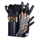 - 18-TEILIGES MESSERSET : Das 18-teilige Küchenmesserset beinhaltet:12 Stück Messer (darunter 6 Steakmesser und 6 Kochmesser), 1 PC Küchenschere, 1 PC Küchenschere, 1 PC Universalschäler, 1 PC abnehmbarer Halter, Messerschärfer und Holzblock