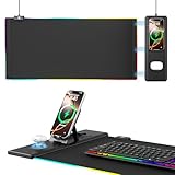 - Led Mousepad mit Handyhalterung – Unser Tastatur Unterlage & Mauspad XXL unterstützt mehrere Lichtmodi und bietet 14 umschaltbare Lichteffekte, darunter statische und dynamische Beleuchtung. Verwenden Sie dieses Schreibtischunterlage mit Ladefunktion, um beim Spielen oder Arbeiten eine unverwechselbare Atmosphäre zu schaffen. Das einzigartige, faltbare Design der Handyhalterung sorgt dafür, dass Ihr Mobiltelefon immer griffbereit ist, egal ob Sie spielen, Videoanrufe tätigen oder mehrere Aufgaben gleichzeitig erledigen möchten.