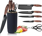 - Umfangreiches Messer-Set: 1x Messerblock, 1x Gemüsemesser 18,5 cm, 1x Steakmesser 22 cm, 1x Fleischmesser 34,5 cm, 1x Zubereitungsmesser 27 cm, 1x Brotmesser mit Wellenschliff 34 cm