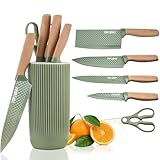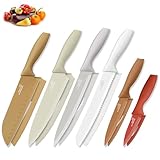 - Auffälliges Profi-Messer-Set: Dieses farbenfrohe Küchenmesserset enthält ein 8-Zoll-Kochmesser, ein 8-Zoll-Brotmesser, ein 8-Zoll-Schnitzmesser, ein 7-Zoll-Santoku-Messer, ein 5-Zoll-Utility-Messer und ein 3,5-Zoll-Schneidemesser für alle Ihre Schneidanforderungen. Und die passenden Messerhüllen für eine einfache Aufbewahrung.