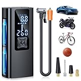 - Effizientes Aufpumpen : Die Elektrische Luftpumpe hat einen eingebauten 8000 mAh Akku, die Reifenluftpumpe hat einen eingebauten Hochleistungs-Chip, um Reifen schnell aufzupumpen. Sie bietet einen maximalen Druck von 150 PSI und einen Luftstrom von 36 L/Min. In alltäglichen Situationen kann sie kleine Autoreifen (25-36 PSI) in 1 Minute aufpumpen oder Autoreifen (0-36 PSI) in 5 Minuten voll aufpumpen. Effizientes und schnelles Aufpumpen spart Zeit und Mühe