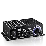 - 【AK-390 Stereo Verstärker】AK-390 hat ein einfaches Aussehen, mit Höhen- und Bass-Tasten, MIC und USB-Buchse, Master-Lautstärke und Mikrofon-Lautstärkeregler, und FM-Radio-Funktion. Im Vergleich zum AK-380 verfügt der AK-390 über 2 Mikrofonanschlüsse, was bedeutet, dass dieser Stereoverstärker nicht nur die Klangqualität für Ihr Hörvergnügen verbessern kann, sondern auch zum Karaoke-Singen verwendet werden kann. Darüber hinaus hat der AK-390 eine Mini-Größe, die sowohl für den Heimgebrauch als auch für den Außenbereich geeignet ist;