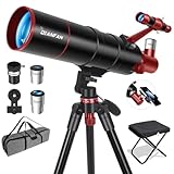 - Überlegene Optik: Die 90-mm-Öffnung eignet sich hervorragend für die Lichtsammlung und liefert hellere, klarere Bilder von Himmelsobjekten. Mit einer Brennweite von 900 mm, drei Okularen (25 mm, 10 mm, 6 mm) und einer 3x Barlow-Linse bietet dieses Teleskop eine breite Palette von Vergrößerungen (36x bis 450x) für detaillierte Planetenansichten und weite Sternenfelder. Es bietet die perfekte Balance zwischen hoher Vergrößerung und breitem Sichtfeld.