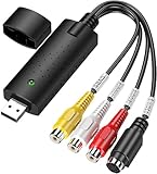 - USB-Videoaufnahmekarte: Der USB-Videoaufnahmeadapter bietet eine Verbindung zwischen einem PC und einem Videogerät mit Cinch-Anschluss oder S-Video-Anschluss, wie Vhs, Vcr, DVD. Enthält Ntsc, Secam, Pal und Pal/60 Video und Audio. Unterstützt Helligkeit, Kontrast, Farbton und Sättigungssteuerung. Erfassen Sie Audio ohne Soundkarte. Nehmen Sie hochwertige Videos und Audio über die beliebte USB 2.0-Schnittstelle auf und benötigen Sie keine externe Stromversorgung.