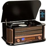 - VINYL PLAYER IM RETRO-DESIGN: Dieser Plattenspieler im klassischen Retro-Look ist mehr als nur ein Record Player. Der Plattenspieler verfügt über eine Vielzahl von Funktionen, darunter einen Aux-Eingang, CD-Player, DAB Radio und einen USB- und Kopfhöreranschluss.