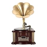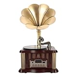 - ✅ Originalgetreues Vintage-Design: Trichter Grammophon im Stil der 1920er Jahre mit kunstvoll geschnitztem Holzgehäuse und großem polierten Messingtrichter – ein echter Blickfang für jedes Ambiente.