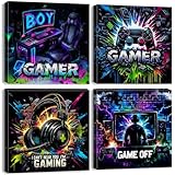 - 【Neon Spiel Leinwandbild Größe】30x30cm x4 , insgesamt 4 Paneele. Neon Gaming Leinwand Wandkunst für Jungenzimmer Dekoration, Kinderzimmer Wanddekoration, gerahmt und mit Haken zum Aufhängen.
