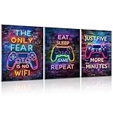- Dynamische Neon-Designs: Gaming Deko Poster zeigen drei energiegeladene Motive mit "EAT SLEEP GAME REPEAT", "THE ONLY FEAR IS NO WIFI" und "JUST FIVE MORE MINUTES" Schriftzügen im Neon-Stil. Die lebendigen Gamepad-Designs vor Gaming-Atmosphäre im Jugendzimmer.