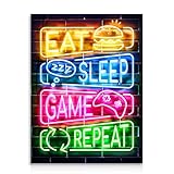 - BUNTE LEINWANDDRUCKE: Diese Leinwanddrucke zeigen den Cyberpunk-Stil und die Neonlichter „EAT SLEEP GAME REPEAT“, die dem Raum eine besondere Note verleihen. Perfekt für Spielzimmer, Wohnzimmer, Büro, Schlafzimmer oder jeden anderen Raum.