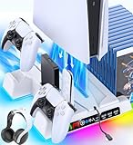 - All-In-One PS5 Zubehör für Alle PS5 Slim/PS5 Digital Edition & PS5 Disc Edition Konsole: Robuste PS5 Ständer + Stark Kühl PS5 Lüfter + Zwei PS5 Controller Ladestation mit LED Anzeigen+ Headset Halterung + 15 Spiele Lagerung + 23cm Typ C-C Kabel + 4 Rutschfeste EVA-Pads +1 USB-Anschluss+Lüfter Taste. Sparen Sie Platz und halten Sie Ihren Tisch aufgeräumt, kühlen Sie die PS5 Konsolen kraftvoll ab, Coole RGB-Lichtspiel-Atmosphäre, eine großartige Geschenkoption für PS5-Gamer.