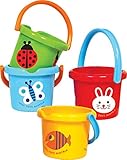 - Der bunte Eimer bringen Schwung in jeden Sandkasten. Die verschiedenen Farben (gelb, blau, grün, rot) bieten verschiedene Motive (Fisch, Schmetterling, Marienkäfer, Hase).