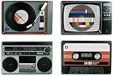 - Das perfekte Geschenk für Oldie- und Retroliebhaber. Die Tischsets zeigen einen Plattenspieler, einen Röhrenfernseher mit Testbild, einen Ghettoblaster und eine Kassette.