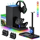 - 【6 IN 1 Ständer für XBOX SERIES X】: Vertikaler Ständer für Xbox Series X kombiniert die Funktionen von Konsolenlüfter, Dual-Controller-Ladegerät, 15 RGB-Lichtmodi, 2 x 1400mAh Akku, 10Pcs Game Discs, Headset-Ständer, extra USB-Anschluss, etc., die den Platz für Gaming-Equipment stark spart, perfekt integriertes Design, um alle zusätzlichen Funktionen zu bieten, die Sie benötigen. 【Bitte beachten Sie: Die Konsole, Controller, Headset, Ladekabel und Spiele sind NICHT enthalten】.