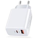 - 【QC3.0+PD Netzstecker USB C】 Das handy ladegerät ist mit einem 20W USB C PD Anschluss und einem 18W USB A Anschluss im 2 in 1 Design ausgestattet, mit dem Sie 2 Geräte gleichzeitig aufladen können. Hinweis: Wenn die beiden Ports zusammenarbeiten, teilen sie sich die maximale Ausgangsleistung von 15W (5V/3A).