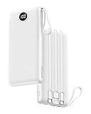 - 🔋【All-in-One Ladelösung mit 4 Kabeln】 Power Bank 20000mAh mit Integrierte Kabel (USB-C/kompatibel Lightning/USB-A/Micro-USB) – lädt bis zu 4 Geräte gleichzeitig ohne Zubehör. Kompatibel mit iPhone 16/15/14, Samsung Galaxy, Huawei, iPad u.v.m.
