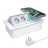 - Multifunktionale Einbausteckdose mit Klappdeckel: Diese Tischsteckdose kombiniert 2 Schuko-Steckdosen, USB-A & USB-C Ladeanschlüsse sowie eine kabellose Qi-Ladestation in einem kompakten Design – perfekt für Küche, Büro oder Konferenzraum