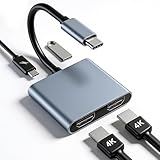 - Genießen Sie 4K-Videoausgabe: Mit dem USB-C-zu-Dual-HDMI-Adapter können Sie den Inhalt Ihres Laptops gleichzeitig auf zwei Monitoren mit 1080P@60Hz anzeigen. Wenn Sie nur einen HDMI-Anschluss verwenden, kann die Auflösung bis zu 4K@60Hz betragen. Hinweis: Bitte stellen Sie sicher, dass Ihr Laptop, Monitor und HDMI-Kabel 4K oder 60 Hz unterstützen, da die Ausgabe sonst nicht 4K oder 60 Hz beträgt.